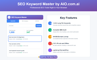 SEO Keyword Master By AIO.com.ai is a free software for Chrome, that belongs to the category 'Add-ons & Tools'.About SEO Keyword Master By AIO.com.ai for Chrome